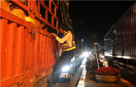 夜間綠農(nóng)車輛多,據(jù)統(tǒng)計(jì),當(dāng)天凌晨早班臨海南收費(fèi)所出口綠農(nóng)車108輛,是平時(shí)日均數(shù)量的八九倍。短時(shí)間內(nèi)的“井噴式”增長(zhǎng),這又是一個(gè)大考驗(yàn)?!叭?hào)綠色”、“一號(hào)綠色”、“二號(hào)綠色”……“來啦!”旁站人員箭步?jīng)_過去拍照取證、檢查車輛。大貨車又高又寬,平時(shí)需登專用扶梯進(jìn)行檢查,可在大流量面前保安全省時(shí)間是第一要旨,這些個(gè)巾幗女將們面對(duì)高貨車,一手拉著車把,一腳踩在車杠上,迅速上車開展核查,執(zhí)行速度絲毫不遜于男同志。有時(shí)剛從這輛貨車上下來,又立刻奔向了其它車道。晴夜當(dāng)空,車道間一個(gè)個(gè)忙碌的身影不停穿梭著,卻不言乏力。