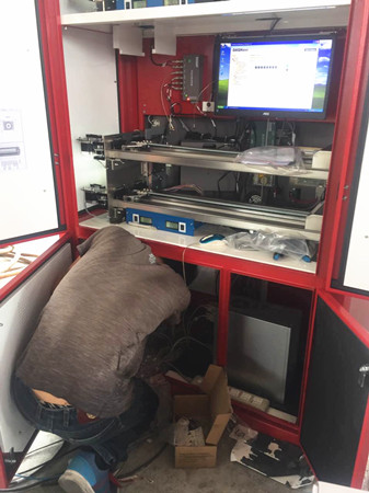 圖為工作人員正在對發(fā)卡機(jī)內(nèi)部進(jìn)行接線
