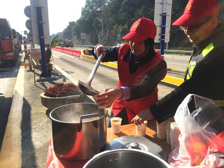 圖為工作人員給過往司機(jī)送姜茶