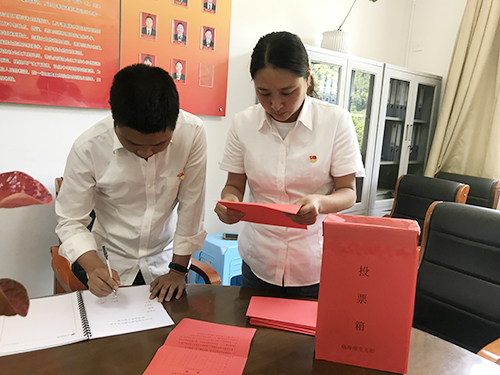圖為投票現(xiàn)場 會議通過舉手表決方式一致通過了選舉辦法和監(jiān)票人、計票人名單。本次選舉大會應到正式黨員11名,實到10名。經(jīng)過計票、監(jiān)票等程序,以差額無記名方式推選孫明偉、周戰(zhàn)、陳瑩三名同志為新一屆支部委員會委員。在隨后召開的支委會第一次會議上,選舉孫明偉任支部書記,周戰(zhàn)任紀律委員,陳瑩任組織宣傳委員。