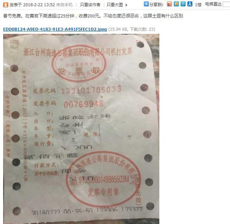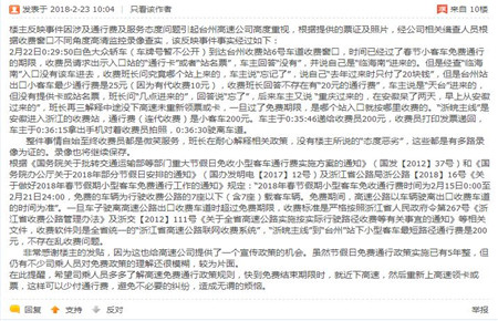 集團(tuán)對(duì)此事件高度重視,當(dāng)即調(diào)取當(dāng)時(shí)多路監(jiān)控錄像,還原了事件真相。2月22日凌晨0:29:50,投訴人駕駛小轎車(chē)進(jìn)入臺(tái)州所6號(hào)車(chē)道,時(shí)間已經(jīng)過(guò)了春節(jié)小客車(chē)免費(fèi)通行的期限,收費(fèi)員黃智超請(qǐng)求出示入口站的通行卡或者紙質(zhì)繳費(fèi)憑證,車(chē)主回答無(wú)卡無(wú)票,聲稱(chēng)自己是從臨海南上進(jìn)入高速。經(jīng)查證,臨海南并沒(méi)有該車(chē)的入口信息。收費(fèi)班長(zhǎng)再次詢(xún)問(wèn)時(shí),車(chē)主說(shuō)“忘記了”,說(shuō)自己“去年過(guò)來(lái)時(shí)只付了20塊錢(qián)”,但是臺(tái)州站出口小客車(chē)最少通行費(fèi)是25元(因?yàn)橛写召M(fèi)10元),收費(fèi)班長(zhǎng)回答不存在有“20元的通行費(fèi)”,司機(jī)忽而改口說(shuō)是天臺(tái)進(jìn)入的,忽而想了一下又說(shuō)是重慶過(guò)來(lái)的,在安徽呆了兩天,當(dāng)天早上從安徽上的高速。班長(zhǎng)再三解釋中途沒(méi)下高速未重新領(lǐng)票或卡,一旦過(guò)了免費(fèi)期限,是哪個(gè)站入口就按哪里收費(fèi)的。“浙皖主線(xiàn)”是安徽進(jìn)入浙江的收費(fèi)站,通行費(fèi)(連代收費(fèi))是小客車(chē)200元。車(chē)主于0:35:46遞給收費(fèi)員200元,收費(fèi)員打印發(fā)票遞回,車(chē)主于0:36:15拿出手機(jī)對(duì)著收費(fèi)員拍照,0:36:30駛離車(chē)道。