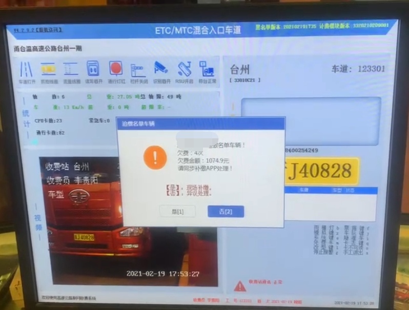 自取消省界收費站全國高速公路聯網后,跨省追繳通行費一直是個大難題,不少司機的省外通行費因無法追繳,造成通行費不斷流失。交通部為了適應“全國一張網”稽核業(yè)務工作需要,確保各收費站現場有序處理追繳名單車輛,避免造成社會輿情和人身財產安全事件,研發(fā)了全國稽核通行費補費系統。 2月19日晚17點50分左右,臺州收費所進口迎來一輛車牌為浙J開頭的六類貨車,車道屏幕顯示為“浙J XXXXXX追繳名單車輛,欠費4次,欠費金額1074.9元,請同步補繳APP處理?!碑敯嗍召M員見此詢問駕駛員是否欠費,并喊來當班班長張錚過來處理。