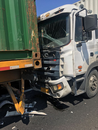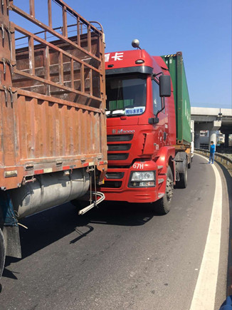 上圖為事故車(chē)輛 當(dāng)天中午,在副站崗?fù)づ哉镜墓ぷ魅藛T發(fā)現(xiàn)該所前方出口不遠(yuǎn)處有貨車(chē)停在那里不動(dòng),以致后面車(chē)輛無(wú)法通行。工作人員隨即跑到前方查看情況,原來(lái)是三輛貨車(chē)發(fā)生追尾,其中有一輛車(chē)車(chē)頭被撞得凹陷,擋風(fēng)玻璃也被撞碎,在了解事故現(xiàn)場(chǎng)無(wú)人員受傷后,工作人員馬上向監(jiān)控中心匯報(bào)情況。由于事故車(chē)輛較大面積滯留,導(dǎo)致后方車(chē)子堵到主線(xiàn)上,一些不明情況的駕駛員在車(chē)?yán)锸箘虐蠢却叽?,現(xiàn)場(chǎng)充滿(mǎn)焦躁情緒。 如何盡快疏通道路?正在食堂吃飯的一班班長(zhǎng)潘慶耀放下碗筷跑到事故現(xiàn)場(chǎng),同工作人員叫前面受損較少的事故車(chē)輛先把車(chē)子開(kāi)出收費(fèi)站,再讓第三輛受損嚴(yán)重的車(chē)子試著發(fā)動(dòng)車(chē)子開(kāi)出去,所幸三輛車(chē)子都能開(kāi)離車(chē)道。在將地上的破損碎片清理到車(chē)道兩旁后,工作人員繼續(xù)指揮車(chē)輛向前行駛,收費(fèi)內(nèi)廣場(chǎng)在較短時(shí)間內(nèi)恢復(fù)了正常通行。 沈芬芳