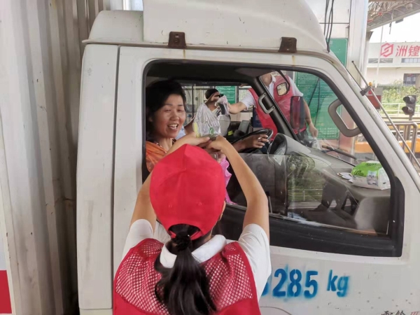 圖為志愿者們正在向過(guò)往司乘人員派發(fā)消暑飲品