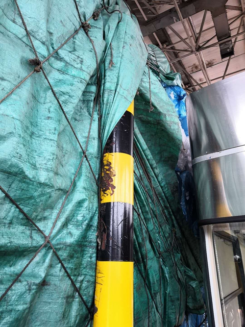 圖為篷布纏繞防撞柱 在與司機溝通后,工作人員用剪刀剪開篷布及尼龍網(wǎng),司機和陳軍用工具頂住貨物防止貨物墜落。經(jīng)過近20分鐘的努力,終于將篷布與防撞柱分離。 在此,筆者提醒各位貨車司機,出發(fā)前一定要仔細檢查車上綁扎物是否扎緊,避免因自身疏忽造成不必要的損失。 洪燈杰