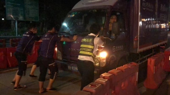 圖為收費(fèi)員幫助司機(jī)將故障車輛推出車道