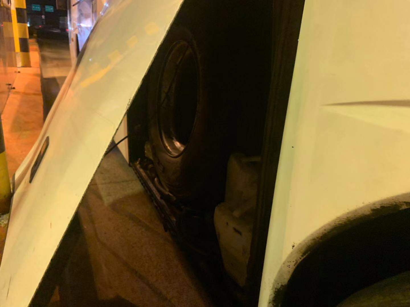 圖為被物品擠開的客車側(cè)門 此次事故由于客車車箱內(nèi)放置過多的物品,在車箱門邊上還硬塞了幾只大輪胎,最終導(dǎo)致輪胎將側(cè)門擠開而沒被司機(jī)發(fā)現(xiàn),在高速過ETC車道時(shí)箱門撞到了設(shè)備,司機(jī)對(duì)此也是后悔不已。 近期,收費(fèi)站發(fā)生過不少同類事件,有司機(jī)通過ETC車道時(shí)因車速過快未感應(yīng)到線圈,擋風(fēng)玻璃撞到欄桿;有集裝箱后門沒關(guān)撞到ETC設(shè)備。在此提醒過往司乘行車前務(wù)必要檢查好車輛安全情況,過ETC車道需要慢行。如果在高速上出現(xiàn)突發(fā)情況也不要慌張,及時(shí)向工作人員或者撥打求助電話請(qǐng)求幫助。 楊相暖