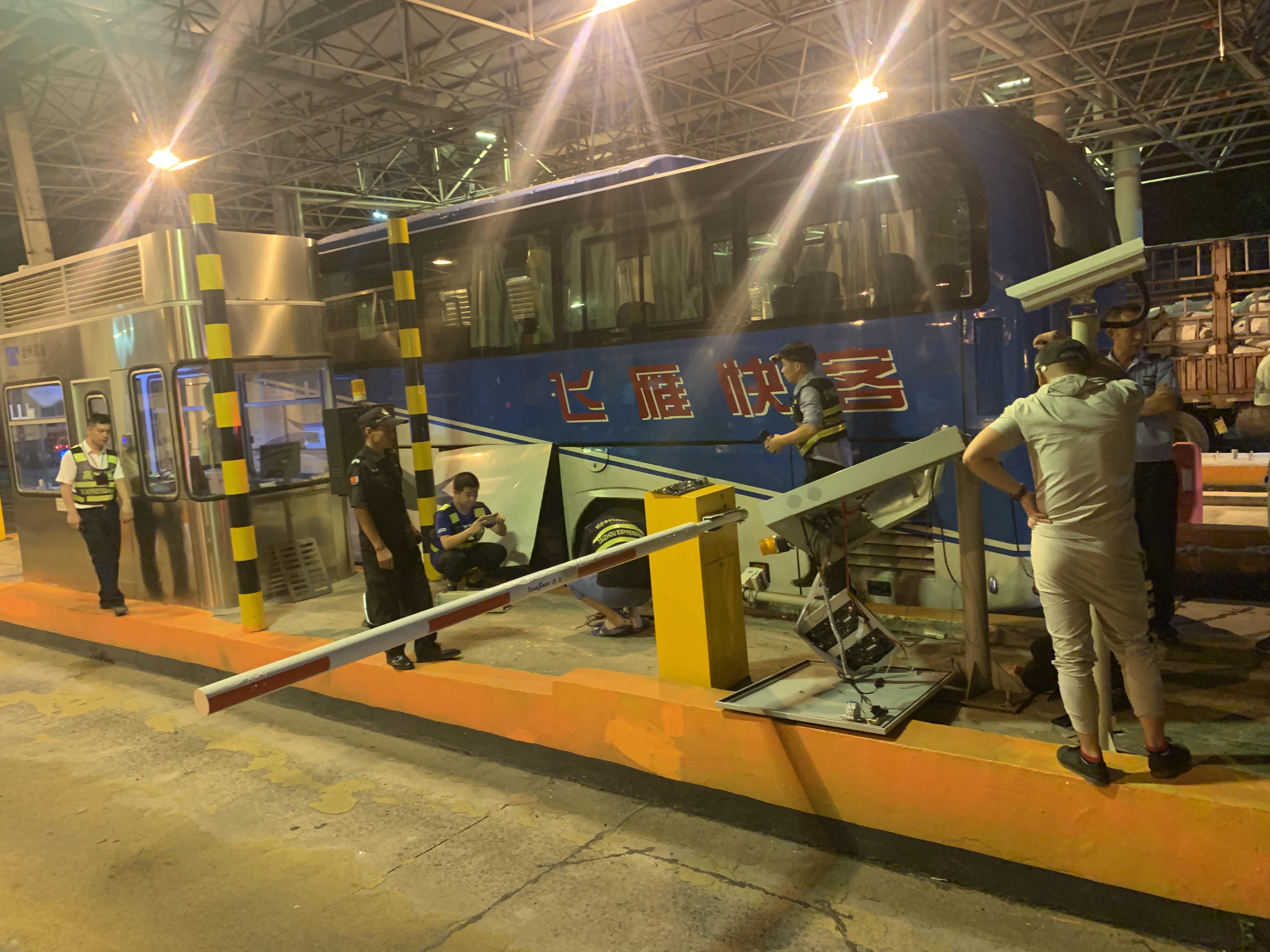 圖為事故處置現(xiàn)場(chǎng) 當(dāng)晚,收費(fèi)員蔣弓在進(jìn)口車道突然聽到一聲巨響,發(fā)現(xiàn)一輛客車裝行李的側(cè)門撞到ETC設(shè)備,且損壞情況非常嚴(yán)重。因?yàn)榇罂蛙嚩氯嚨溃竺娴乃緳C(jī)不明情況排起了車隊(duì)。班長(zhǎng)李寧一邊協(xié)同派出所執(zhí)勤點(diǎn)工作人員維持秩序,一邊向監(jiān)控中心匯報(bào)現(xiàn)場(chǎng)情況。監(jiān)控中心也馬上聯(lián)系了路產(chǎn)、維養(yǎng)中心、高速交警多個(gè)部門。在20分鐘內(nèi)所有部門陸陸續(xù)續(xù)趕到現(xiàn)場(chǎng)。為盡快恢復(fù)交通,維養(yǎng)中心同事馬上對(duì)損壞ETC設(shè)備進(jìn)行拆卸檢測(cè),路產(chǎn)部門對(duì)損壞設(shè)備進(jìn)行定損估價(jià),高速交警勘查現(xiàn)場(chǎng),拍照取證判定事故責(zé)任,溫嶺西收費(fèi)所工作人員維持進(jìn)口秩序,大家都在高效有序地處理突發(fā)事件。