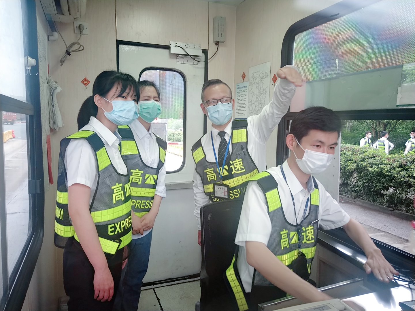 圖為陳軍帶領(lǐng)新員工在崗?fù)づ嘤?/span> 新員工的到來,為該所注入了新鮮的血液,增添了青春活力。為了讓新員工能夠快速“入鄉(xiāng)隨俗”,盡快適應(yīng)收費站工作環(huán)境,順利完成角色轉(zhuǎn)換,當日他們就跟著資深班長陳軍學習相關(guān)業(yè)務(wù)知識。
