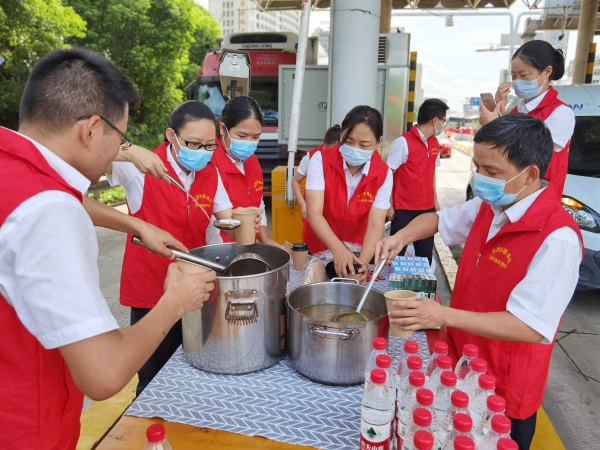 在溫嶺西收費(fèi)所進(jìn)出口處,志愿者們身穿紅馬甲,面帶微笑地向途經(jīng)的司乘們遞上一杯杯蓮子湯、紅棗綠豆湯,并溫馨提醒司乘注意疲勞駕駛。 近日,連續(xù)高溫,驕陽(yáng)似火,為進(jìn)一步延伸文明服務(wù),緩解司乘人員暑熱疲勞,臺(tái)州高速溫嶺西收費(fèi)所組織志愿者積極開展“炎炎夏日送清涼”活動(dòng),為行駛在路上的廣大司乘送上一份夏日的清涼。