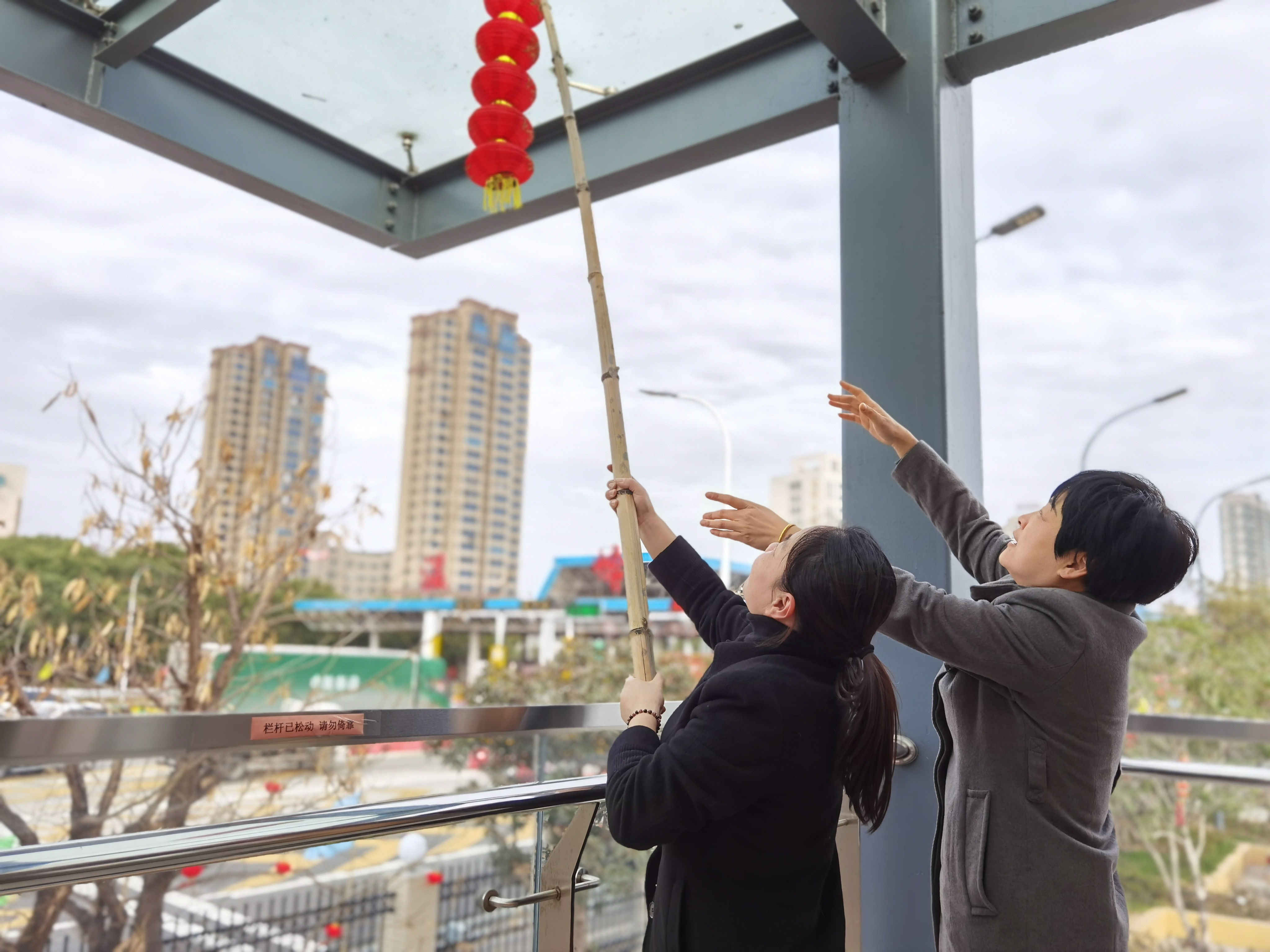 大家分工合作,搬梯子、遞春聯(lián)、貼膠帶、校正高低。在站所內(nèi)每個(gè)角落都掛上了紅彤彤的燈籠;收費(fèi)區(qū)域內(nèi)廣場兩邊的欄桿上扎著一面面彩旗。一幅幅精致喜慶的對聯(lián)、“?!弊郑淮遣势?,一個(gè)個(gè)大紅燈籠把整個(gè)收費(fèi)站所點(diǎn)綴得處處洋溢著濃厚的節(jié)日氛圍,“年味”十足,讓在站員工和過往司乘朋友感受到新年的喜慶氛圍和“家”的溫暖。