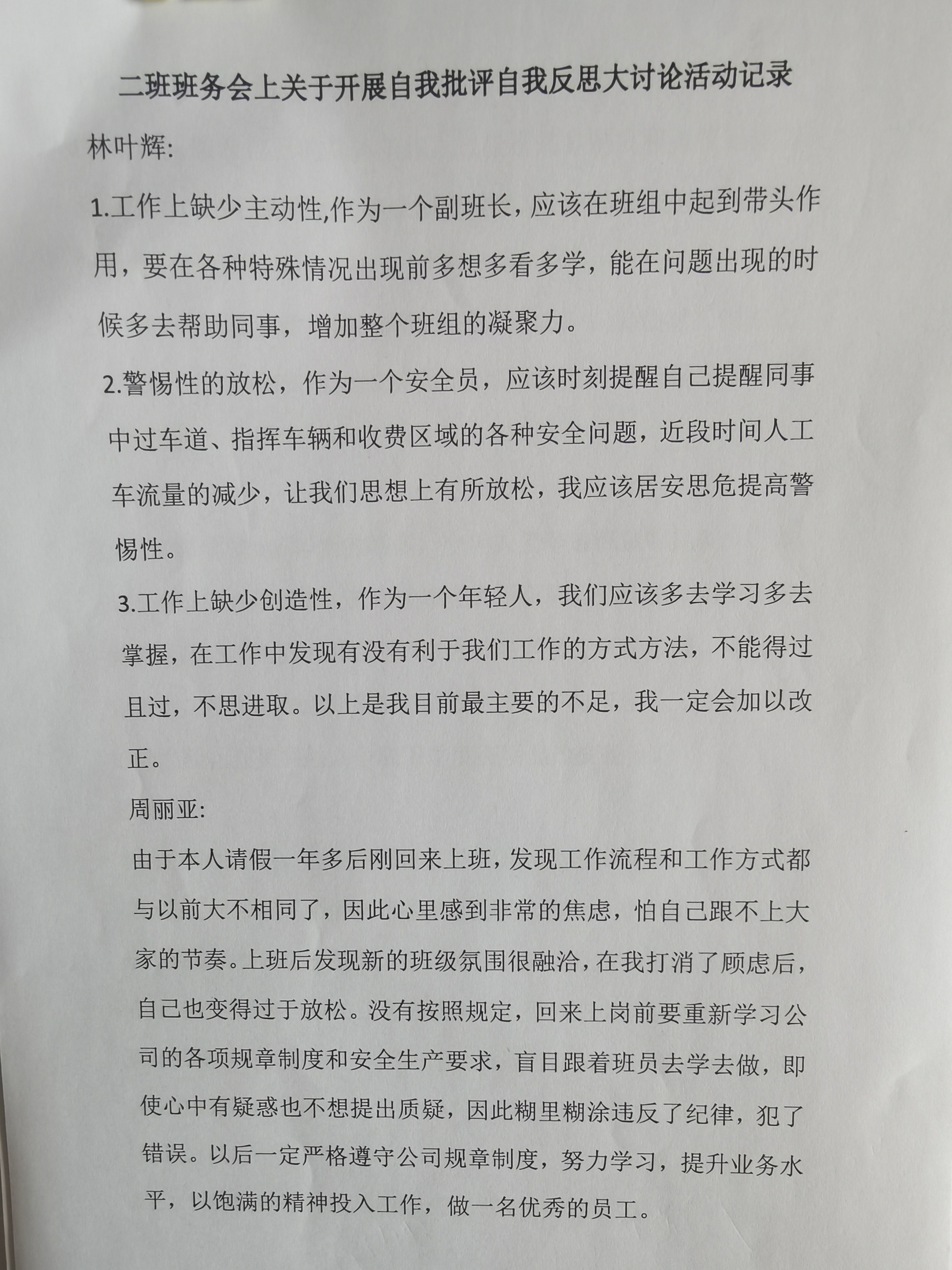 在討論中,大家圍繞自己在思想、學(xué)習(xí)、工作等方面情況,深挖自己的缺點和不足,直面自己的“短”處,并分析原因,拿出解決辦法,然后明確接下去努力的方向。具體問題包括:工作上缺乏主動性和創(chuàng)造性,工作態(tài)度情緒化;存在得過且過、不思進(jìn)取的思想;對自己要求不嚴(yán),遇事強調(diào)客觀理由;隨著車流量的減少,安全警惕性也有所下降等等。