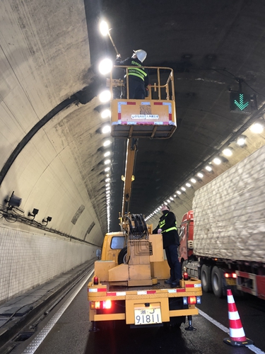 圖為執(zhí)勤隊在擦拭燈具 原定3月27日的黃土嶺溫向隧道清洗計劃由于天氣原因順延,28日上午,所領導正為隧道能否清洗而發(fā)愁, 9點58分只見天空放晴,外面?zhèn)鱽眇B(yǎng)護車警笛聲,養(yǎng)護封道開始?;贾鴩乐馗忻暗睦罾蛲现v的身子早早準備好一切清洗必需品。 “洪瑞、程常你們一組,一個用餐巾紙擦拭攝像機鏡頭、一個用毛刷刷LED燈具表面,這樣可以節(jié)約時間?!标犻L叮囑道。 執(zhí)勤隊有條不紊地開展隧道清洗工作,他們快速地擦拭隧道內(nèi)每個設備,仔細地檢查每個消防、機電設施。