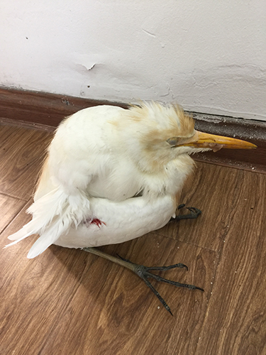 圖為受傷的牛背鷺 走近細(xì)看,這只鳥耷拉著腦袋,有著圓滾滾的小身子,尖尖的嘴巴和細(xì)長的腿,不同于平常所見的鳥類,其左側(cè)翅膀還有紅紅的血印子,估計是被人射獵受傷。 后經(jīng)百度查詢,臺州市林業(yè)專業(yè)人員鑒定確認(rèn),此鳥為省級保護鳥類牛背鷺。專業(yè)人員欣慰地說,幸好隧道所人員及時救助,否則這只鳥鷹會有生命危險。它的翅膀受傷嚴(yán)重,這是奮力飛行一段時間后因受傷而掉落,已經(jīng)沒有了捕殺能力。