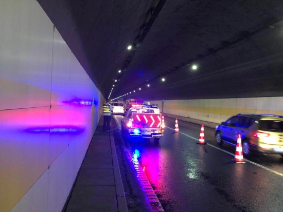 7月14日19時(shí)22分,中控員朱金飛發(fā)現(xiàn)黃土嶺寧向隧道1000米快車道處有車拋錨。立刻呼叫執(zhí)勤隊(duì)前往處置,隨即更改快車道交通信號(hào)。 執(zhí)勤隊(duì)迅速出警,幾分鐘后就趕赴事故現(xiàn)場(chǎng),發(fā)現(xiàn)一輛白色面包車撞在隧道內(nèi)右側(cè),車輪箍嚴(yán)重受損,卡在護(hù)溝里,所幸無人員受傷。執(zhí)勤隊(duì)進(jìn)行提前預(yù)警,預(yù)防二次事故的發(fā)生,并呼叫高速施救車輛支援,幾分鐘后施救車抵達(dá),事故車輛安全拖離隧道,僅僅十分鐘,交通就恢復(fù)暢通。