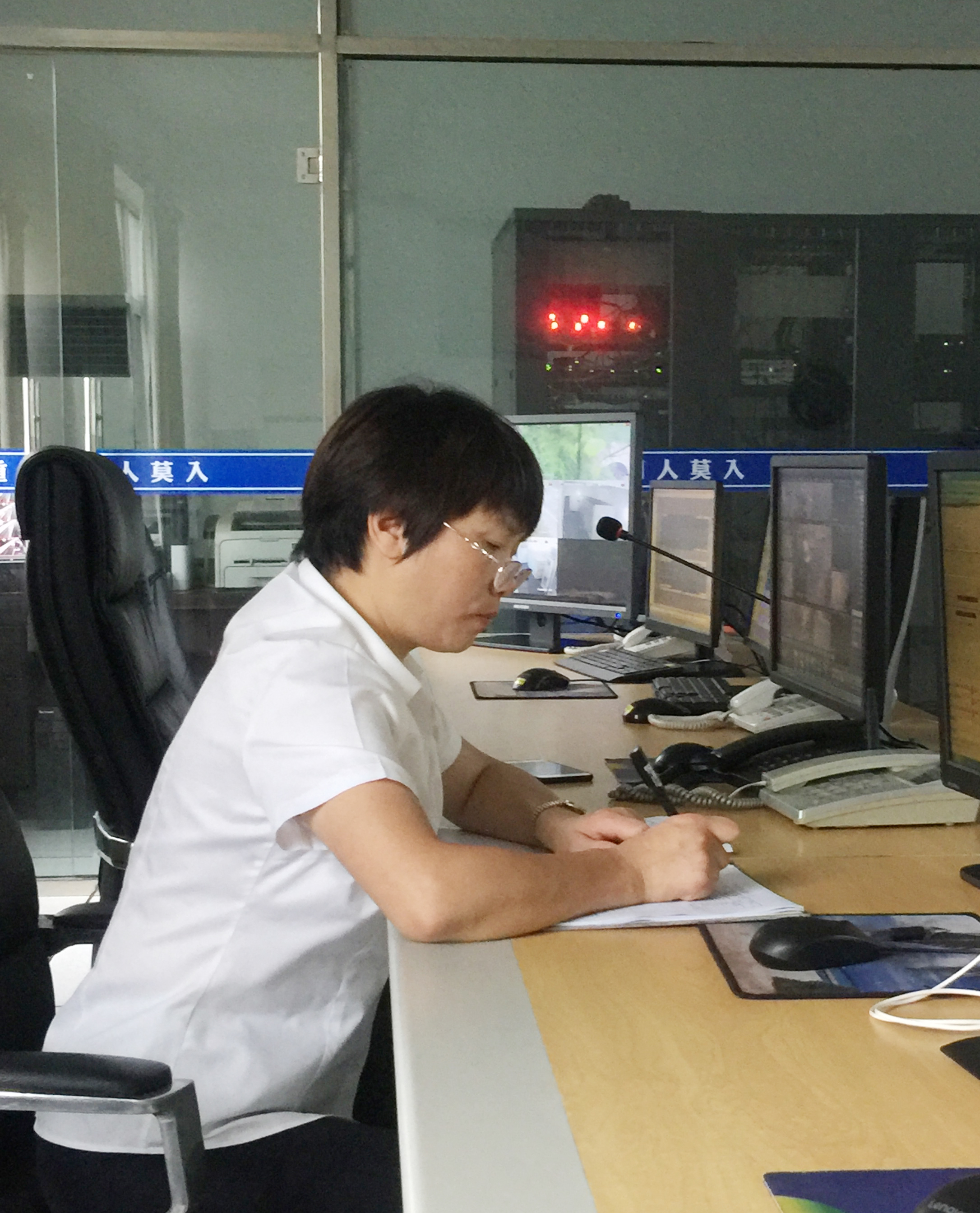 圖為交接班場景 開朗又樂觀,善于團(tuán)結(jié)同事,幾乎是班隊(duì)“組織部隊(duì)”擔(dān)當(dāng)?shù)?/span>“開心果”,她就是三隊(duì)中控員金素彬。別看她平時嘻嘻哈哈大大咧咧,工作起來卻一板一眼,來不得半點(diǎn)馬虎。接班上崗時,只見她一手拿筆,架起老花鏡,認(rèn)真做好中控交接班記錄,仔細(xì)檢查監(jiān)視設(shè)備運(yùn)轉(zhuǎn)情況,確保中控設(shè)備都能正常運(yùn)行。中控室內(nèi),幀幀銀屏,一覽車流,幅幅畫面,縱觀隧道南北動向。7月6日下午4點(diǎn)47分,金素彬敏銳地發(fā)現(xiàn)一輛集裝箱拋錨在寧向隧道停車帶,一半車身掛在主車道上,車流如織呼嘯而過,情況十分危險。于是鏡頭切換、廣播呼叫、電話通報、更改信號燈、情報板、追蹤記錄……一切操作有條不紊、井然有序,如同久經(jīng)沙場的指揮官。就這樣,她又一次通過熒屏和電話,排除安全隱患,保證了隧道的暢通。面對進(jìn)入倒計時的退休日子,她感慨千萬:“十幾年的中控工作還真是舍不得,如果公司需要,我會義不容辭地留下為公司發(fā)展作貢獻(xiàn)。” 平凡的崗位,普通的中控員,他們為守護(hù)隧道的安全暢通奉獻(xiàn)出自己最美好的青春年華,他們默默堅守,日復(fù)一日地做著重復(fù)而單調(diào)的事,卻發(fā)揮著不平凡的作用。 柳媛 林玲