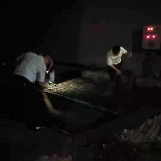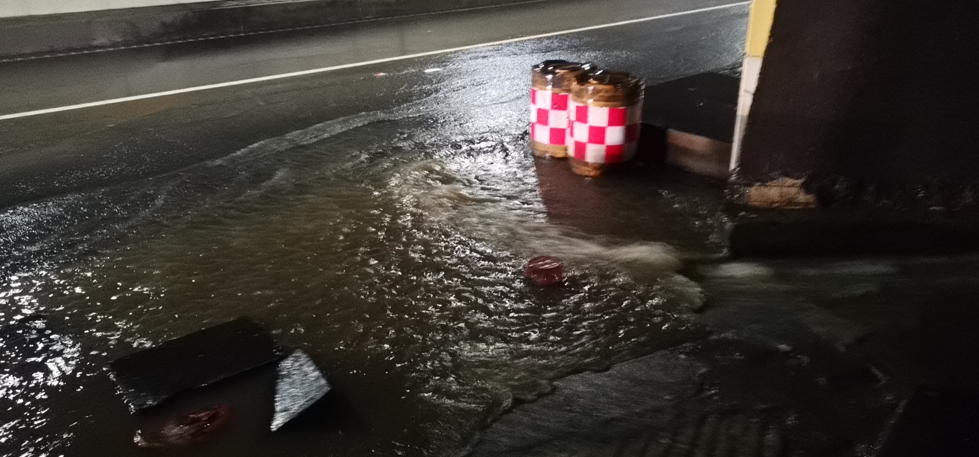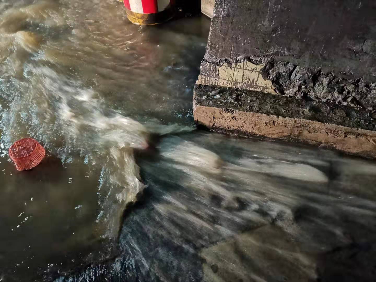 圖為車道水流 當(dāng)晚19:12分,黃土嶺隧道所中控員徐彤霞發(fā)現(xiàn)寧向隧道主車道路面出現(xiàn)積水,如不及時處置,路面濕滑會讓過往車輛打滑,嚴(yán)重影響隧道的安全暢通。為了杜絕安全隱患,管理所立即啟動防汛應(yīng)急方案,中控員第一時間在管理群發(fā)送現(xiàn)場圖片,并在同一時間通知執(zhí)勤隊與監(jiān)控中心。 執(zhí)勤隊員不顧狂風(fēng)暴雨趕赴現(xiàn)場,19:19分,斜井現(xiàn)場山上倒灌入隧道的水嘩嘩直流,儲水池水流急促,執(zhí)勤隊員立即分工合作,一組在主車道擺放安全錐采取防護(hù)措施,并利用沙包,堵住排水溝壁,使水盡量不往外滲,及時避免了積水對隧道內(nèi)行車造成的安全隱患。一組檢查潛水泵是否正常運行,查看積水入侵的原因、排水溝通暢情況。