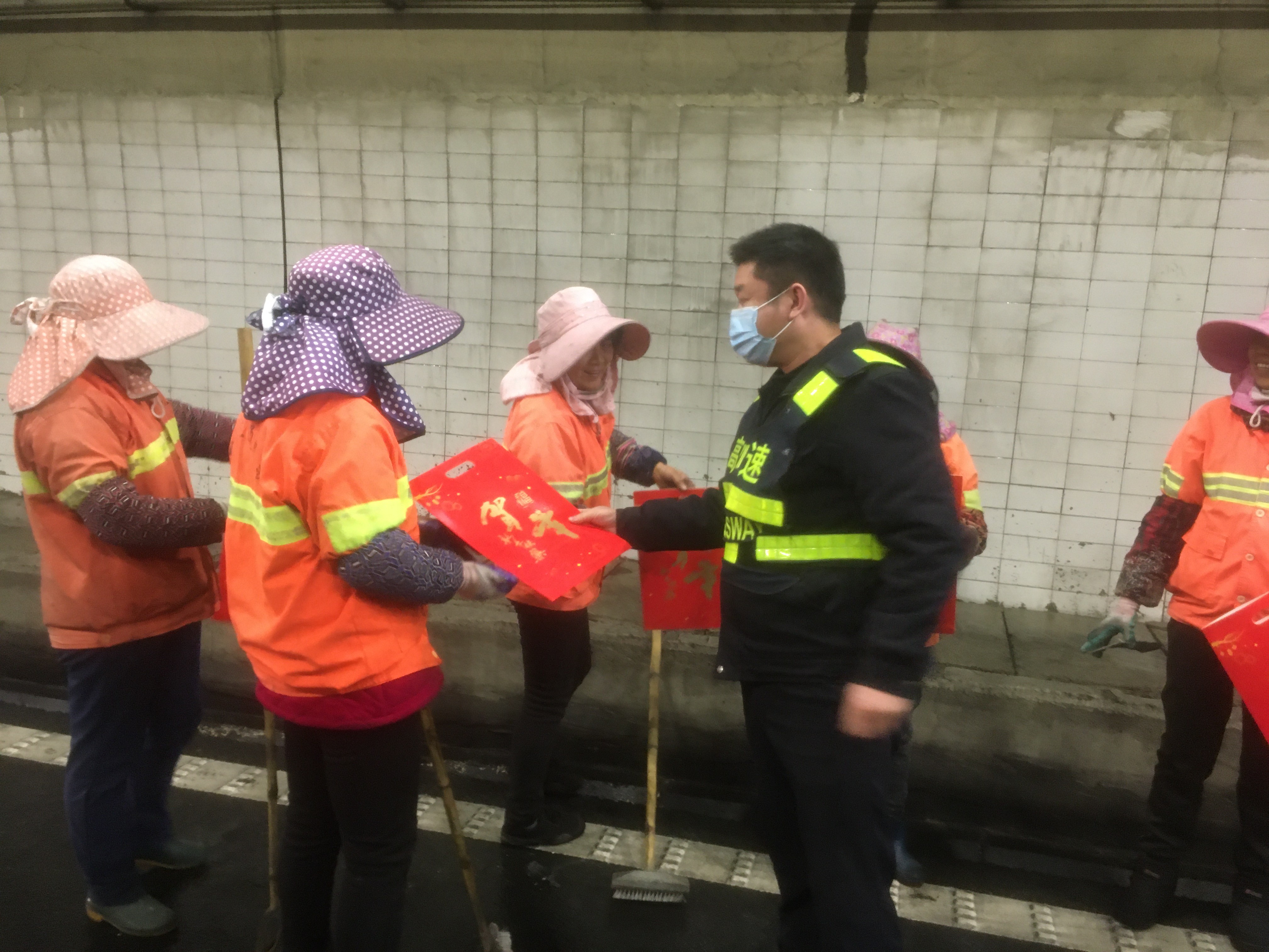 上午十點左右,盧所把工人們迎到食堂,熱情的招呼著大家。當(dāng)班的隊員們把一碗碗熱乎乎的臘八粥送到養(yǎng)護(hù)工人們的手中,吃著這冬日里的熱粥他們臉上露出了由衷的笑容。 下午,從公司匆匆趕回來的應(yīng)所帶領(lǐng)隊員們對隧道的清洗情況進(jìn)行了驗收,肯定了養(yǎng)護(hù)工人們的勞動成果,并表示了親切的慰問,同時把一幅幅春聯(lián)親自送到了他們的手中。