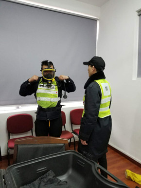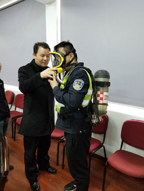 培訓(xùn)中,陶文輝講解了“高速隧道火災(zāi)特點”及呼吸器、防化服的使用方法及相關(guān)要求。話題開啟后,隊員們紛紛參與討論,爭相發(fā)言,講述各自在隧道事故處理中施救和應(yīng)對的經(jīng)歷與心得,交流平日巡查中所需注意的事項,互相提醒工作中的不足,并針對實際問題提出了許多建設(shè)性意見。同時,在主講人的現(xiàn)場演示下,參訓(xùn)人員逐個“以身試法”,進一步熟悉和掌握了防毒面罩的穿戴方法。