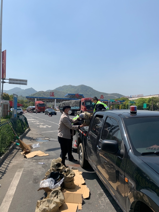 執(zhí)勤隊(duì)員們立即做好現(xiàn)場預(yù)警工作,擺好隔離錐,拿出掃帚快速清理。這時(shí),肇事司機(jī)發(fā)現(xiàn)貨物丟,在溫嶺西收費(fèi)站出口等待。隊(duì)員趕緊清完現(xiàn)場,載著貨物直奔溫嶺西收費(fèi)站。