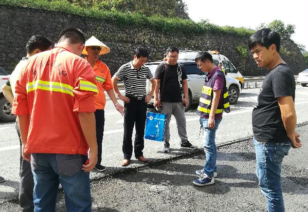 圖為集團(tuán)總工程師江輝與相關(guān)人員在現(xiàn)場協(xié)商病害處置方案 根據(jù)施工方反應(yīng),臨海南匝道段瀝青路面病害較為嚴(yán)重,江輝一行即刻邀請(qǐng)路面專項(xiàng)工程設(shè)計(jì)方共同到現(xiàn)場,仔細(xì)檢查瀝青路面病害情況,并根據(jù)病害程度,裂縫、車轍等情況協(xié)商確定相應(yīng)的專項(xiàng)處置方案,以便更好地開展路面維修工作。