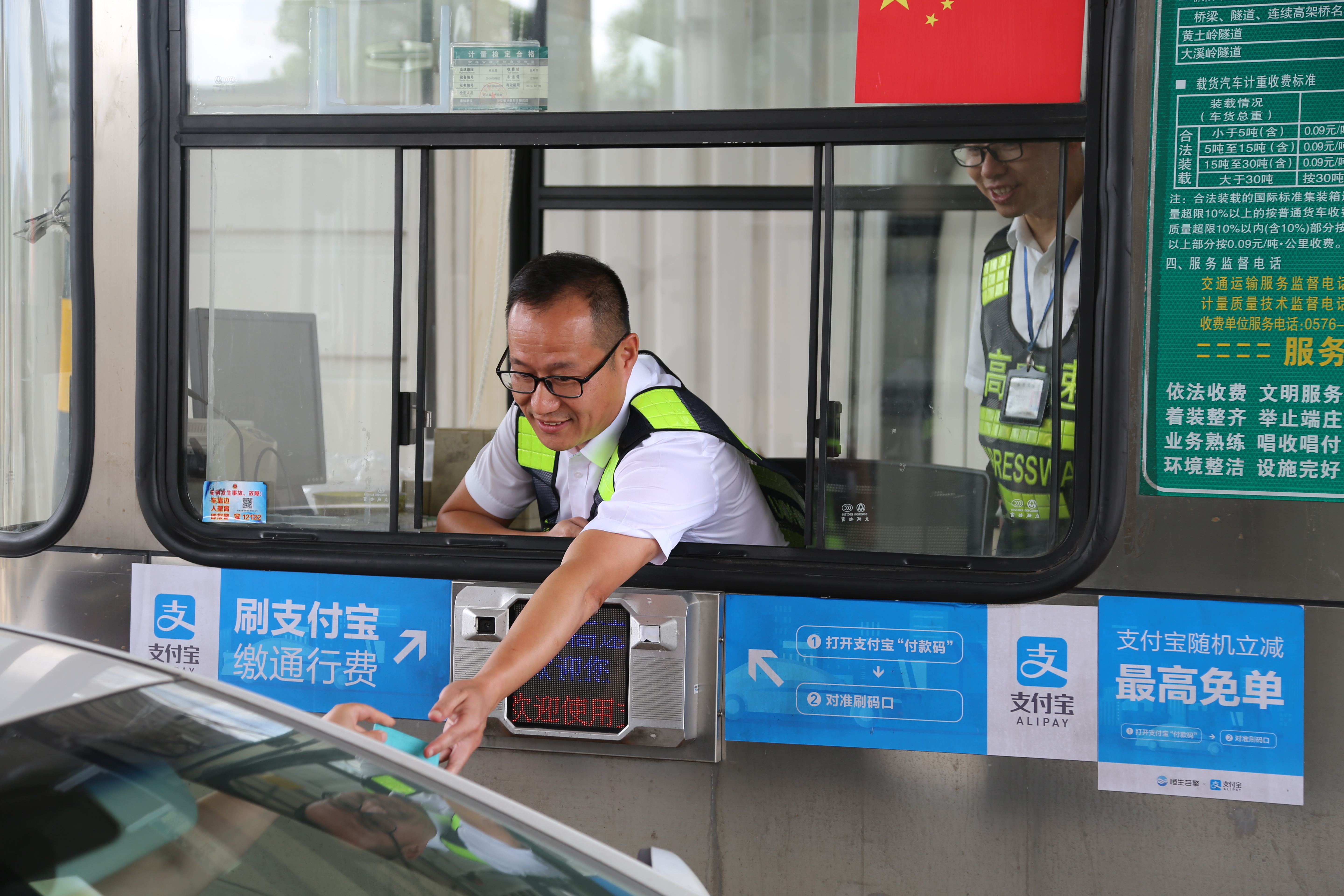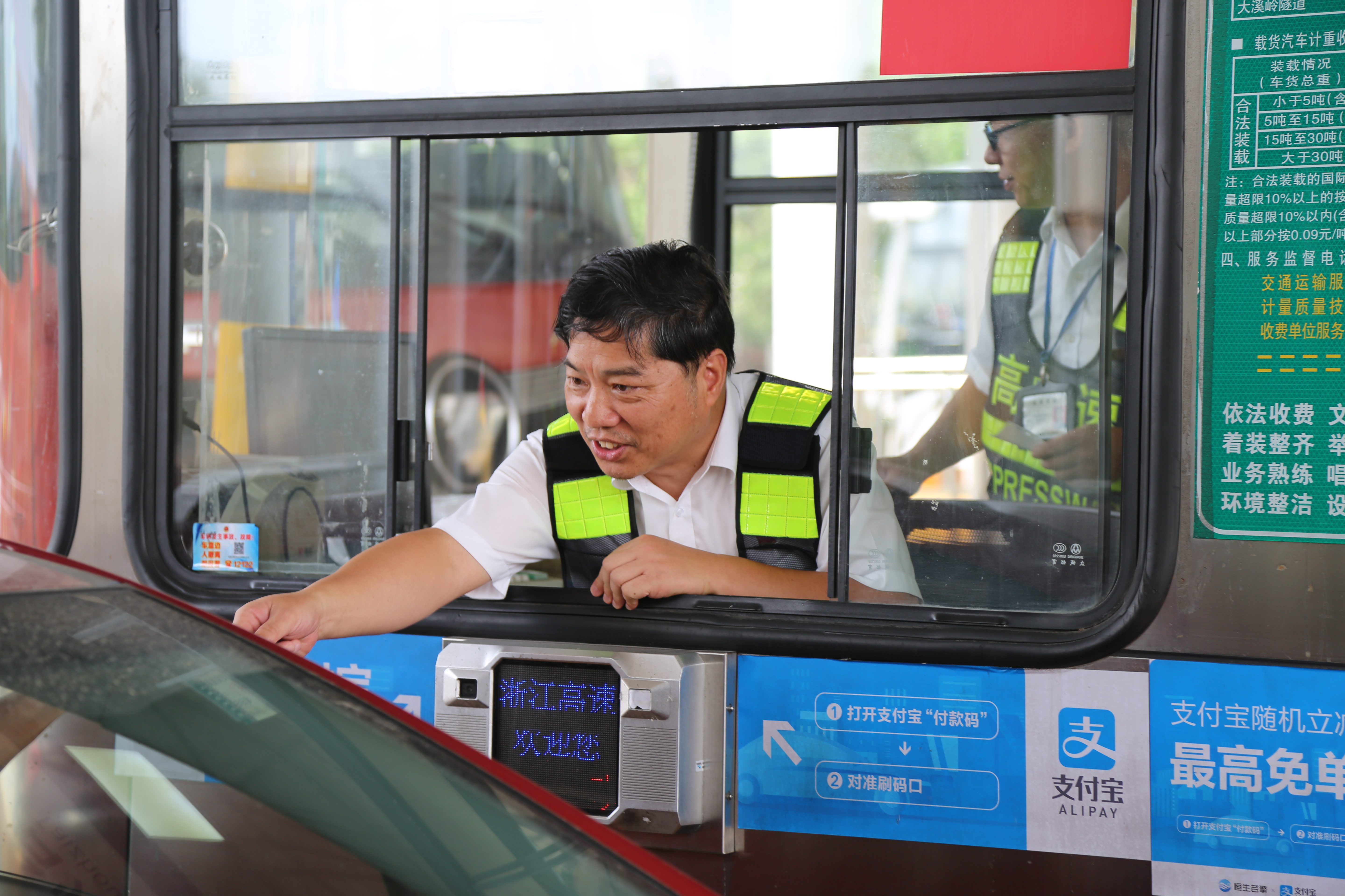 “我再試試,我這個(gè)微笑還標(biāo)準(zhǔn)嗎?”正在臨海南收費(fèi)所二號(hào)收費(fèi)崗?fù)だ锸召M(fèi)的集團(tuán)副總經(jīng)理陳保衛(wèi)認(rèn)真做著收費(fèi)的規(guī)范動(dòng)作微笑示意。