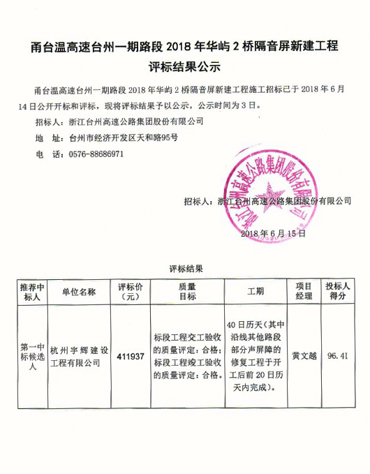 甬臺(tái)溫高速臺(tái)州一期路段2018年華峪2橋隔音屏新建工程評(píng)標(biāo)結(jié)果公示