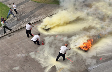 “趕快救火!”隨著教官一聲令響,比武正式開始。“消防員”們個個行動神速,鎮(zhèn)定地手持滅火器,拔掉保險銷,對準著火點壓下手把噴射,動作連貫一氣呵成。