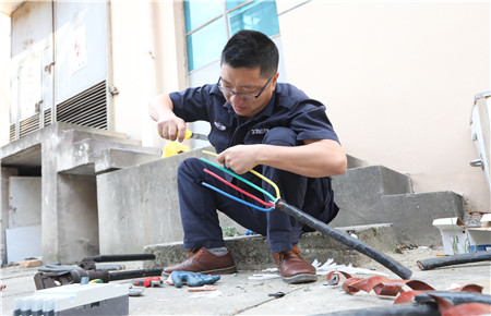 臺州收費所倉庫前方的空地,電工操作的選手們一字排開,他們熟練地用電工刀,在電纜上輕輕一劃一轉(zhuǎn),整個絕緣外殼立馬脫離,緊接著去鉛皮、掰角度、壓接頭,不到10分鐘,一根三相四線電纜接頭就此制作完成了。