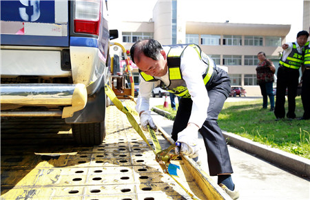 當哨聲響起時,清障作業(yè)的考試開始了。就象聽到路上事故的指令,選手們飛快躍上清障車,趕到“現(xiàn)場”,一組兩名員工,一名快速擺放隔離筒進行預(yù)警,一名趕到“事故車”前進行背拖拖曳作業(yè),綁帶作業(yè)、固定輪胎,甚至警燈、檔位、手剎、安全帶、巡視事故車等細節(jié)也有具體要求,雖然上午天氣涼爽,可因為比賽的速度比拼與現(xiàn)場緊張的氣氛,選手們額頭都冒出了熱氣。
