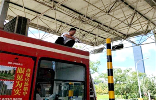 圖為收費所員工正在加固崗亭空調(diào)外機