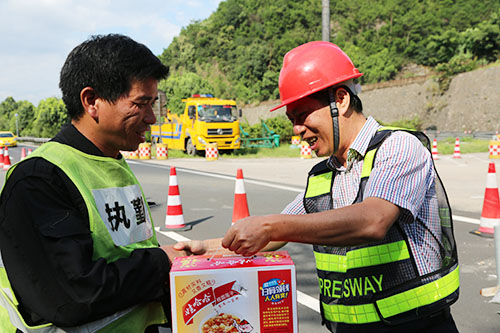 圖為集團(tuán)總工程師江輝為交通疏導(dǎo)員送上慰問品 大溪嶺隧道溫向隧洞中,施工人員正在拆除原設(shè)備,除了噪音和洞中彌漫的灰塵,高溫高濕的環(huán)境也嚴(yán)重考驗(yàn)著施工人員的身心。江輝提著慰問品,向隧洞中和烈日下正在崗位上工作的施工人員和交通疏導(dǎo)員送上慰問品??紤]到一線人員的特殊情況,江輝特別要求采購人員將送清涼物資改為八寶粥、蛋黃派、飲料等可以直接食用的物資,方便施工人員可以隨時(shí)補(bǔ)充能量。