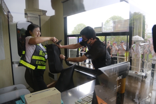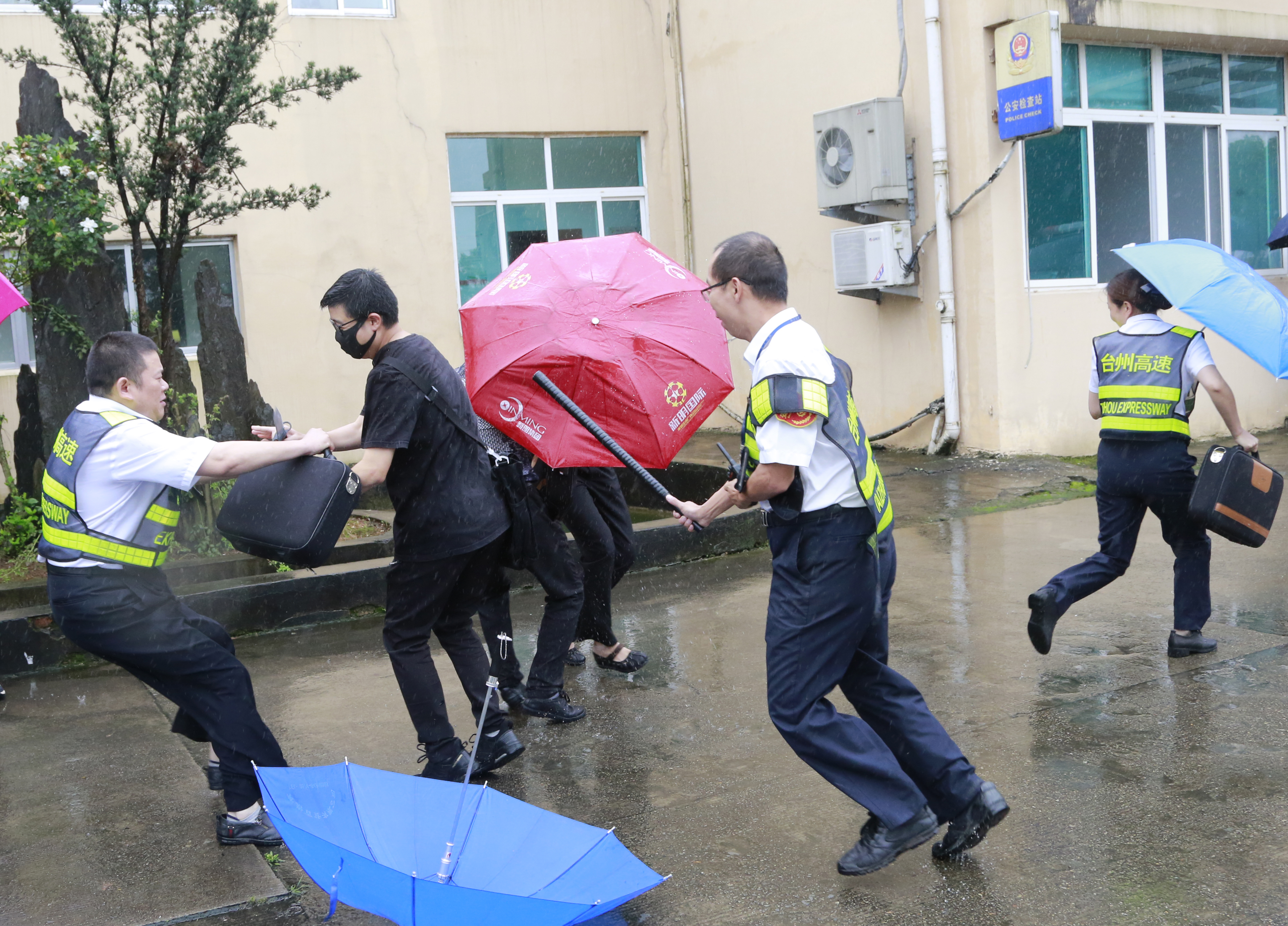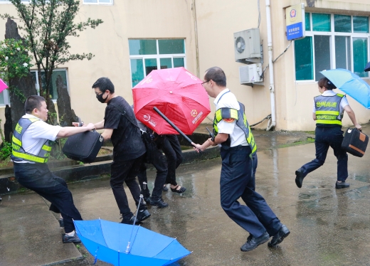 圖為演練現(xiàn)場 隨后,多名參演員工冒雨模擬收費崗亭和列隊下崗遭遇“歹徒”搶劫的情景開展防盜搶演練。現(xiàn)場,2名蒙面歹徒執(zhí)仿真刀、軟棍威脅收費員交出現(xiàn)金,危機之中,收費站立即啟動應急處置預案并報警求助,收費員有效與歹徒周旋,應急處置組人員迅速攜鋼叉、橡膠棒、勞動工具等赴現(xiàn)場支援,值班領導、收費班長、監(jiān)控員合力協(xié)作應對歹徒,防盜搶演練順利結束。