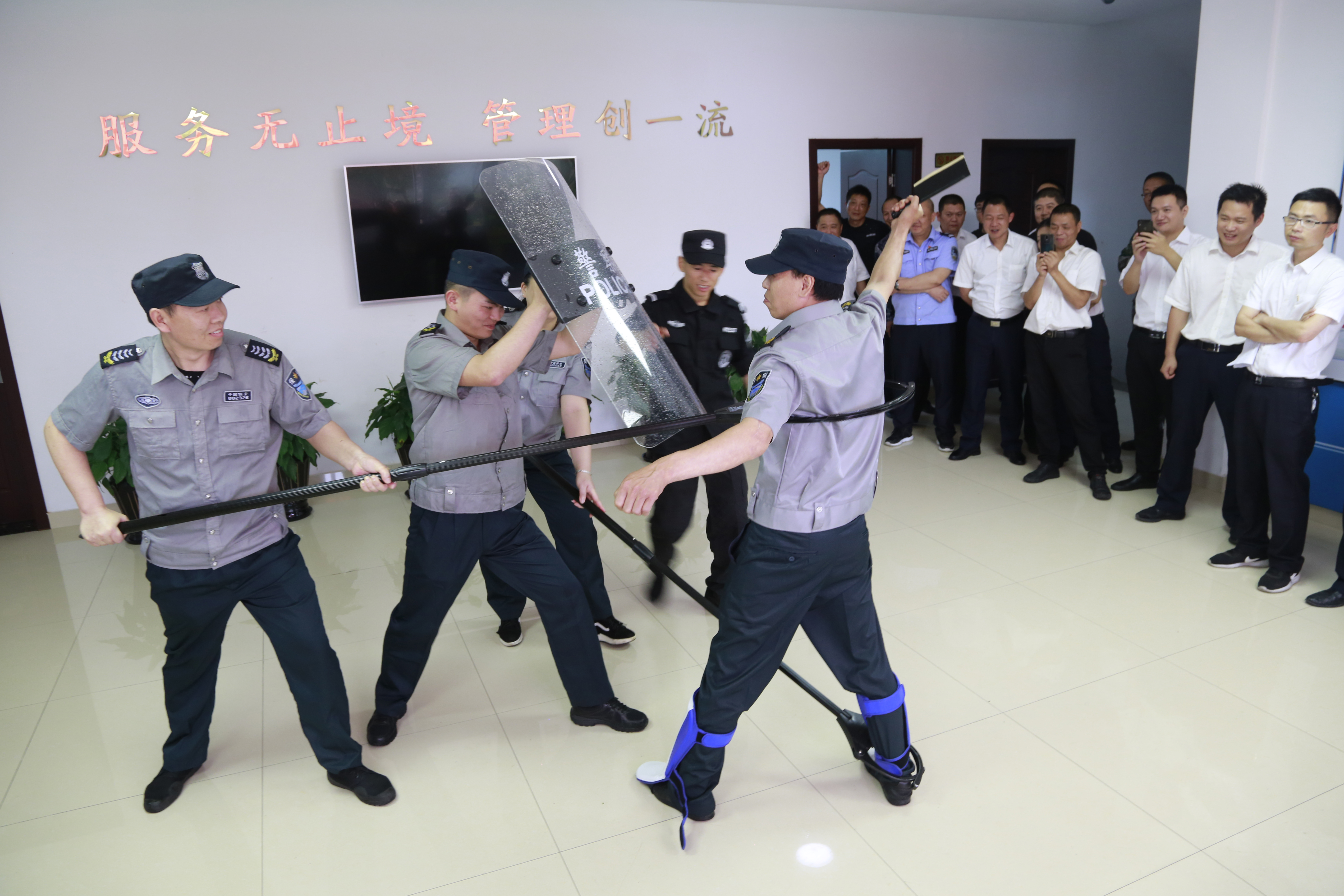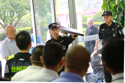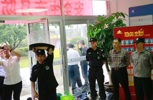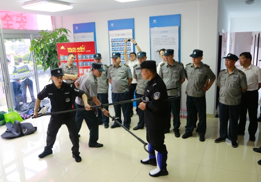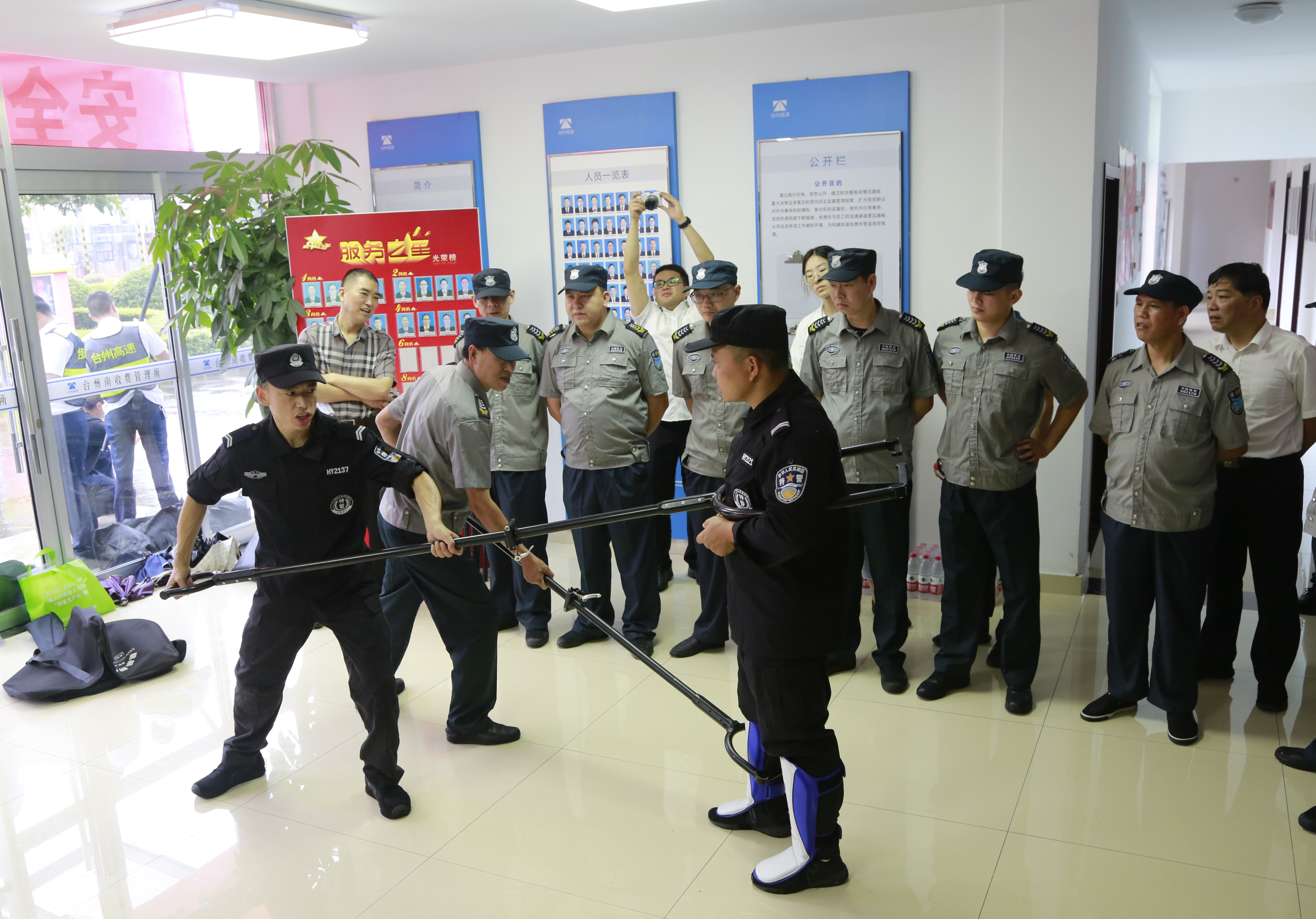 圖為物業(yè)人員現(xiàn)場練習器械使用 演練開始前,盧尚明對防爆盾牌、防爆鋼叉、抓捕器、警棍等各類防爆器材的功能和使用方法進行一一講解,并示范操作,以及帶領大樓浙師大印象物業(yè)人員現(xiàn)場練習器械使用。