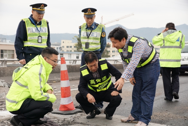 集團聯(lián)合高速交警、路政檢查第一階段斷流施工情況 11月7日上午,集團聯(lián)合高速交警、高速路政等單位實地踏勘了集團沿線斷流施工現(xiàn)場,檢查第一階段施工進展情況及現(xiàn)場交通管控點、收費站分流點交通流等情況,集團總工程師江輝、高速交警臺州支隊副支隊長沈汝寬、高速路政領導參加檢查。