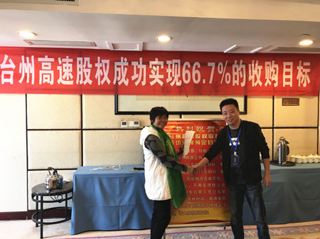 臺(tái)州高速股權(quán)集中和優(yōu)化工作領(lǐng)導(dǎo)小組辦公室主任、臺(tái)州高速集團(tuán)總經(jīng)理張建平鄭重地宣布:“至此,全市共完成臺(tái)州高速股權(quán)轉(zhuǎn)讓6947萬股,臺(tái)州市屬國企及黃巖財(cái)務(wù)開發(fā)公司合計(jì)持股數(shù)1.441億股,完成了66.7%的預(yù)定收購目標(biāo)?!?/span>