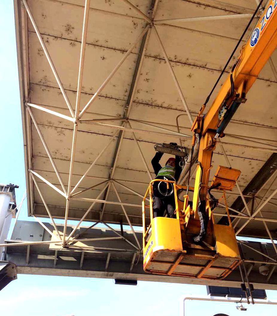 圖為隊員正在更換車道頂棚燈 期間在臺州南收費所發(fā)現(xiàn)有兩個車道出現(xiàn)異常,即當重型車輛通過時,輪檢鐵板和稱臺出現(xiàn)不正?;蝿忧闆r。根據(jù)以往經(jīng)驗,此情況如不進行及時維修,對車輛計重將造成嚴重影響。對此,技術人員不僅對鐵板上每顆螺栓都進行了認真細致的重新加固,之后不厭其煩對每個稱臺限位都進行了多次調整,直至將晃動幅度控制在正常范圍內。