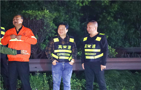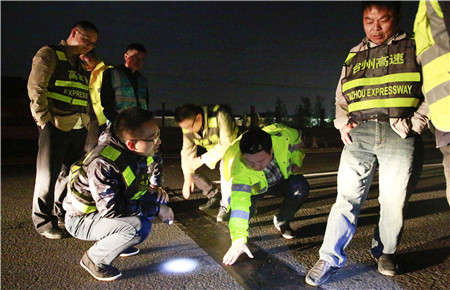 圖為工程養(yǎng)護(hù)部經(jīng)理何翔堅守在夜間封道施工現(xiàn)場