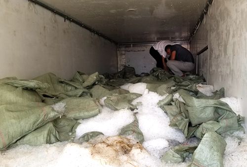 李貴陽打開車輛后廂門,迎面撲來一陣冷風,一眼望去車廂里面全部是一袋袋的花蛤,上面還壓著袋裝的冰塊和零碎的碎冰,車廂內部看不清楚。憑借多年的工作經驗和認真負責的工作態(tài)度,李貴陽二話沒說,直接爬上濕滑的車廂,踏過冰袋和碎冰,深入到車廂里面去檢查,把冰袋掀開后,結果發(fā)現(xiàn)下面全部是空桶。原來這樣做既可以增加貨物面積也可以使重量加重,從而達到綠農政策的免費通行要求。