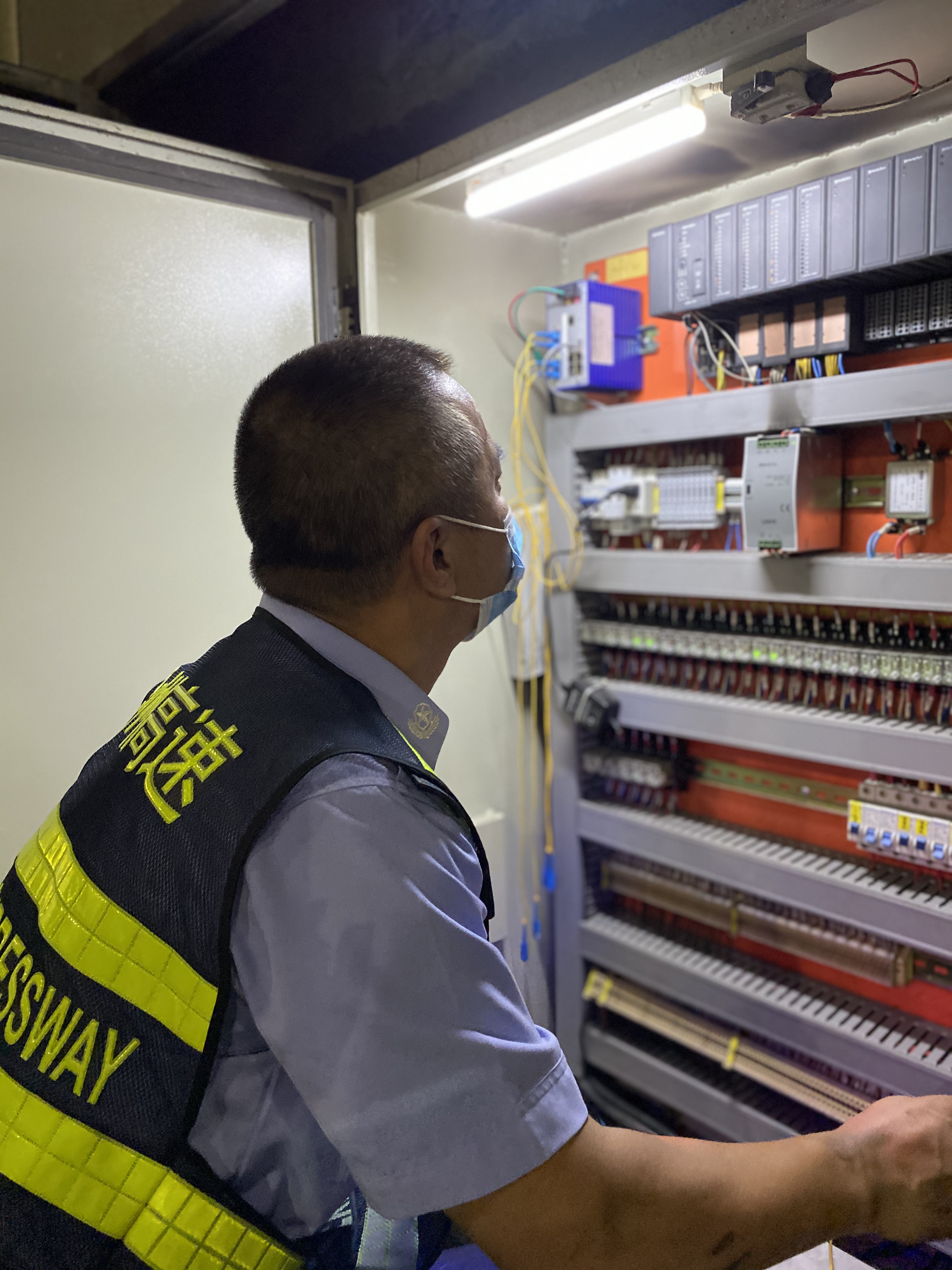 雖然隧道內(nèi)沒有烈日的灼燒,但日均4萬的車流,加上尾氣排放,導(dǎo)致隧道內(nèi)的氣溫遠(yuǎn)高于室外。當(dāng)室外37°C時,整個隧道里宛如一個蒸籠。盡管如此,廣場上、電纜溝上隨時都有執(zhí)勤隊員忙碌的身影。他們來回徒步穿梭于隧道,檢查指示燈、消防設(shè)備箱、緊急電話、火災(zāi)報警等設(shè)施設(shè)備,排查各類安全隱患,修復(fù)受損設(shè)備,處理各種突發(fā)情況。一趟下來臉和胳膊被熏得黝黑,口罩、衣服濕了又干、干了又濕,盡管工作量大、強度高,他們從不喊苦說累。