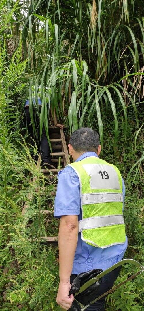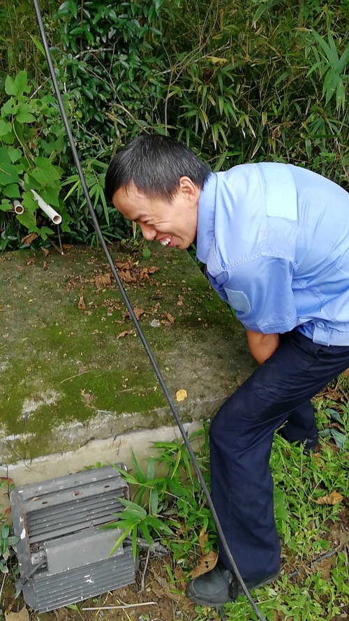 9月23日早上8點45分,中控員發(fā)現(xiàn)大溪嶺隧道北高位水池圖像模糊,照明燈不亮了。 為保障隧道消防安全,中控員對消防水池的水位需時時關注,萬一水池漏水無法及時查看,如遇火災,消防水供應不上,后果不堪設想。隊長意識到事情的嚴重性,即刻安排電工湯寧光和陳幸趕往北面山上的高位水池位置。初秋的山上植物茂盛,原來通往水池的小路早已淹沒在雜草間,隊員們提著工具,憑著記憶找小路,單手撥開雜草往山上走,到達高位水池之后,他們分工協(xié)作,一邊檢查線路,一邊抬開井蓋并下到水池檢查照明燈,經(jīng)過檢查后發(fā)現(xiàn)只是線路有點松動,陳幸馬上對線路進行加固。
