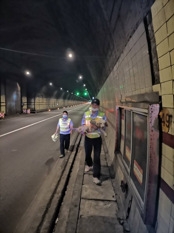 為確保安全,執(zhí)勤隊員們帶上手套,拿著掃把和麻袋,到達現(xiàn)場后發(fā)現(xiàn)是一只白色的拉布拉多犬,它一動不動地趴著,可憐巴巴地看著隧道里的車子極速而過,很顯然小狗感覺到害怕,知道趴在這里才是最安全的。隧道所安保人員陶文輝再三確認小狗沒有攻擊意圖后,試著慢慢靠近它,給它喂食香腸,并耐心安撫,直至順利地將其抱起,帶上了巡邏車。狗是靈性的動物,認準了第一個抱起它的陶文輝,乖乖地依偎在他的懷里。 此前,隧道里從未出現(xiàn)寵物狗被遺忘的事,執(zhí)勤隊長忙回到監(jiān)控室查看錄像,準備幫它尋找主人,經(jīng)過仔細查找終于發(fā)現(xiàn)隧道里有過一次大堵車,小狗就是那個時候被主人遺忘的。按照時間推算,這條小狗已經(jīng)在隧道里呆了近14個小時,還好它聰明,趴在那兒一動不動沒有到處亂跑。最后經(jīng)過半個多小時的查找,隊長終于與車主取得聯(lián)系,晚上22點左右,車主來到大溪嶺隧道所認領,多次感謝我們對小狗的救援和照顧。 孫鵬