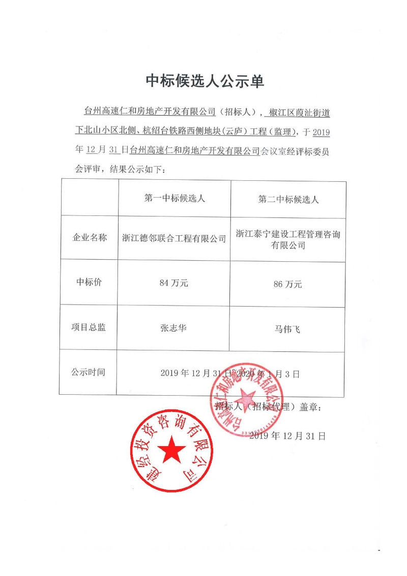 椒江區(qū)葭沚街道下北山小區(qū)北側(cè)、杭紹臺鐵路西側(cè)地塊(云廬)工程(監(jiān)理)中標候選人公示單