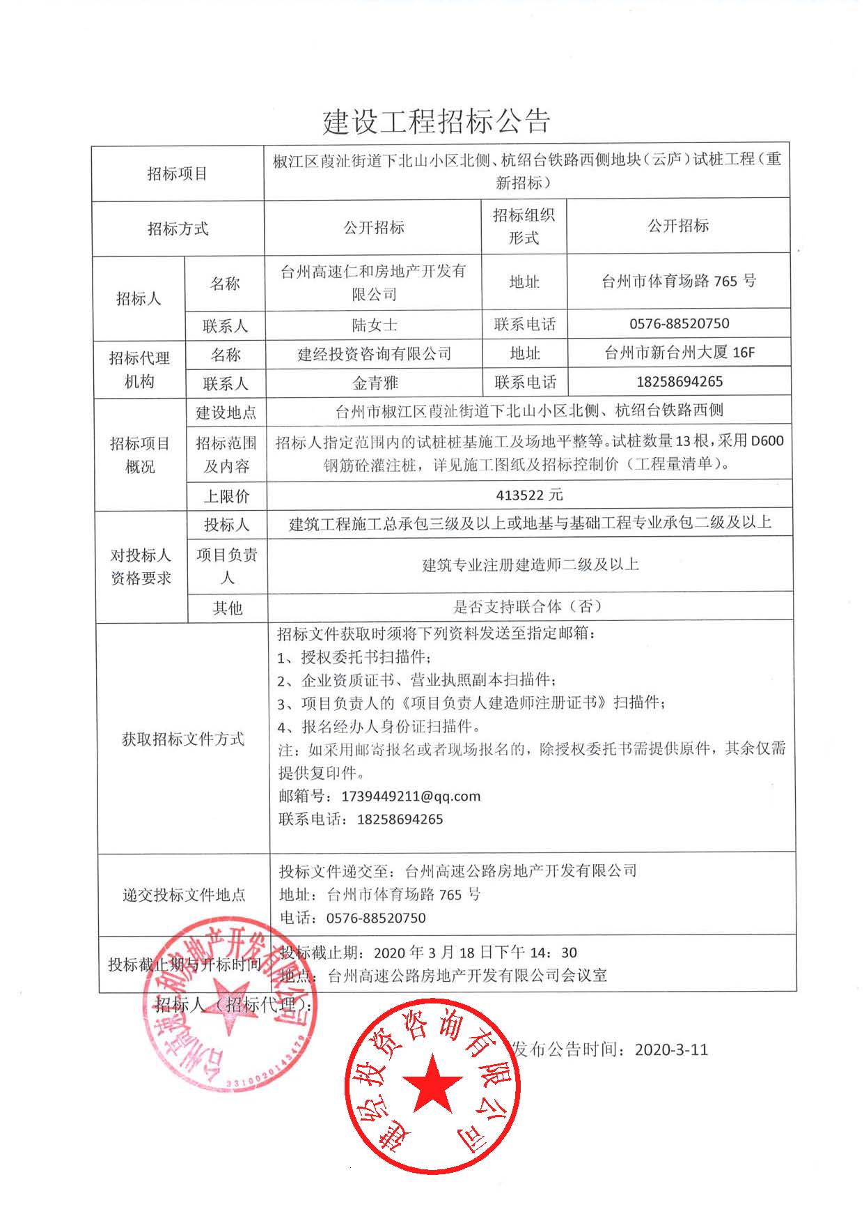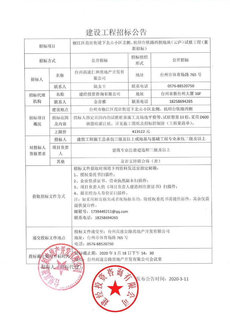 椒江區(qū)葭沚街道下北山小區(qū)北側(cè)、杭紹臺(tái)鐵路西側(cè)地塊(云廬)試樁工程(重新招標(biāo))公告