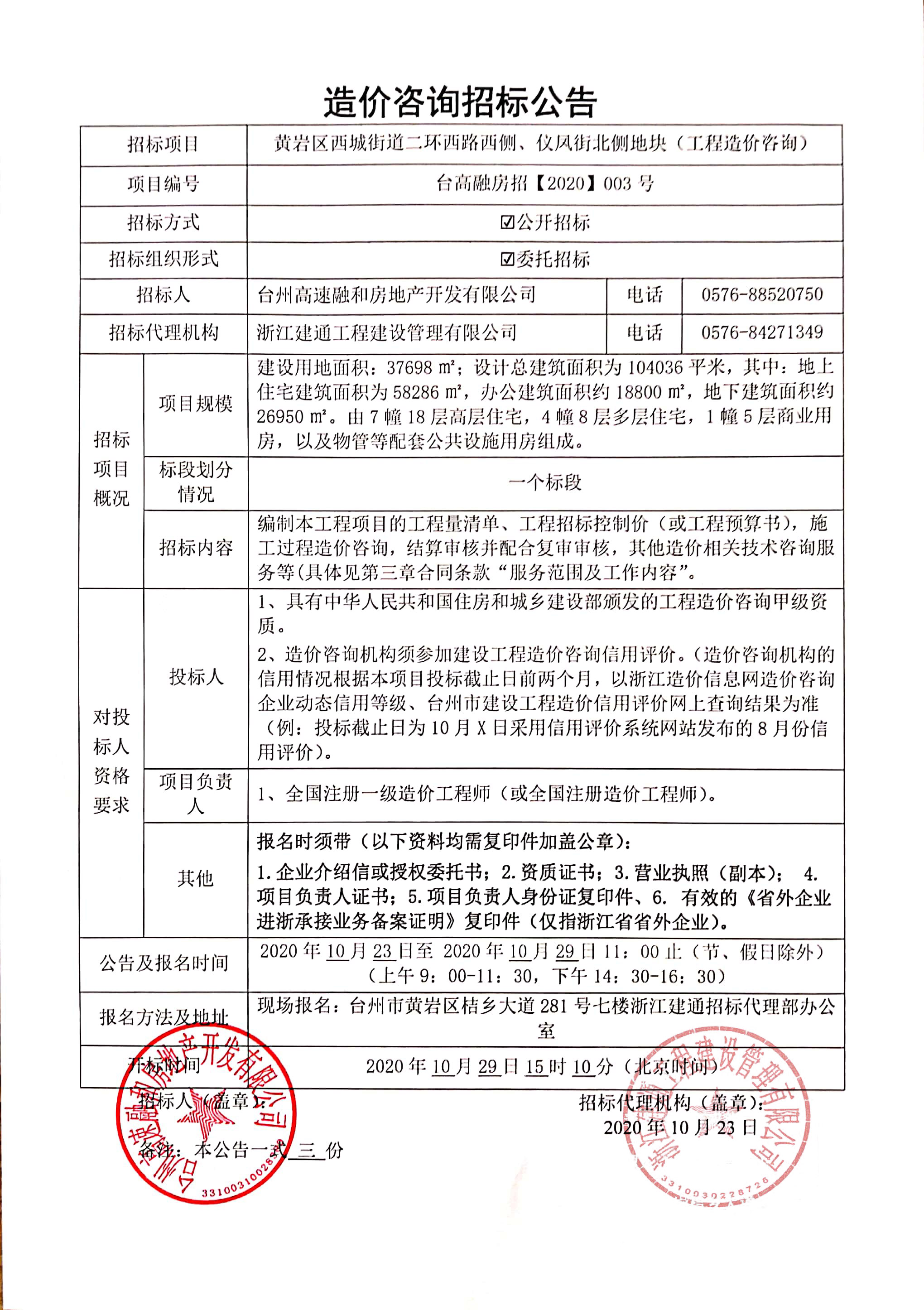 黃巖區(qū)西城街道二環(huán)西路西側(cè)、儀鳳街北側(cè)地塊(工程造價咨詢)招標(biāo)公告