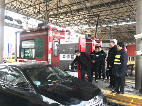 圖為公司總經(jīng)理張建平給過往司乘人員發(fā)卡