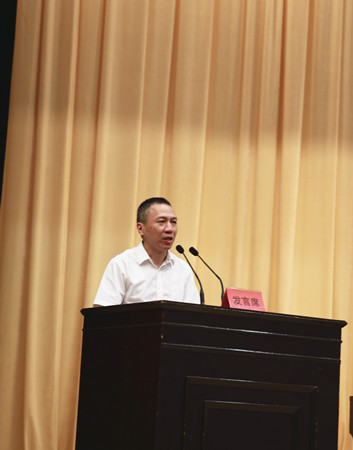 圖為集團黨委副書記、副董事長、總經理張建平在主席臺上作交流發(fā)言