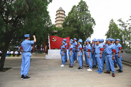 圖為黨員在梁家河合影 不顧前一天的舟車(chē)勞頓,第二天一大早,黨員們整裝出發(fā),在紅色旗幟引領(lǐng)下,頂著烈日,一路步行到達(dá)寶塔山山頂?!笆肿S土我不放,緊緊兒貼在心窩上。幾回回夢(mèng)里回延安,雙手摟定寶塔山。”綜合支部的小周對(duì)著寶塔山,情不自禁地大聲誦讀起賀敬之的《回延安》。黨員們?cè)谖∥毸赂吲e右拳,用鏗鏘有力的聲音宣讀了入黨誓詞,對(duì)于大家來(lái)說(shuō),重溫入黨誓詞是共產(chǎn)黨員表達(dá)自己為共產(chǎn)主義奮斗終生的最佳方式,黨員們的心靈再次受到震撼和洗禮。