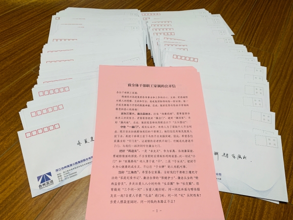集團開展致全體干部職工家屬的公開信活動 6月18日,集團緊貼廉政教育月活動要求,將“致全體干部職工家屬的公開信”交到每一名職工手中,以這種家書形式廣泛宣傳廉潔清正的重要性,呼吁他們爭當(dāng)反腐倡廉的“廉內(nèi)助”。