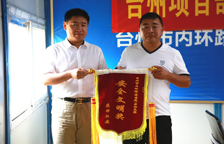 圖為為獲獎施工單位頒發(fā)流動紅旗